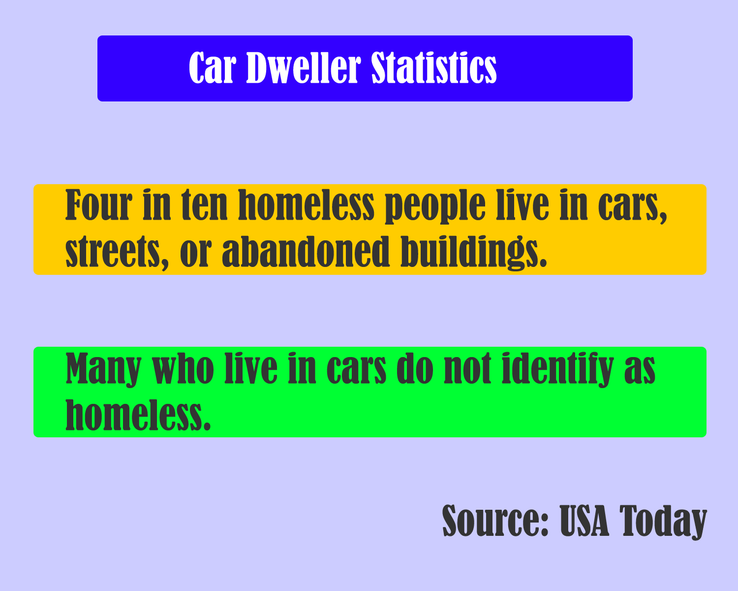 Local ordinances vary, but living in a car, except in designated areas, is generally not encouraged. There are many stories of individuals who have escaped legal scrutiny. The regulatory environment is becoming tougher, though, as rising unemployment rates have forced many individuals to adopt this lifestyle as the only resort. Some counties have regulations that prohibit car owners from staying in their cars for more than six hours at a time. Police scrutiny has increased in neighborhoods where van dwelling is likely to occur.